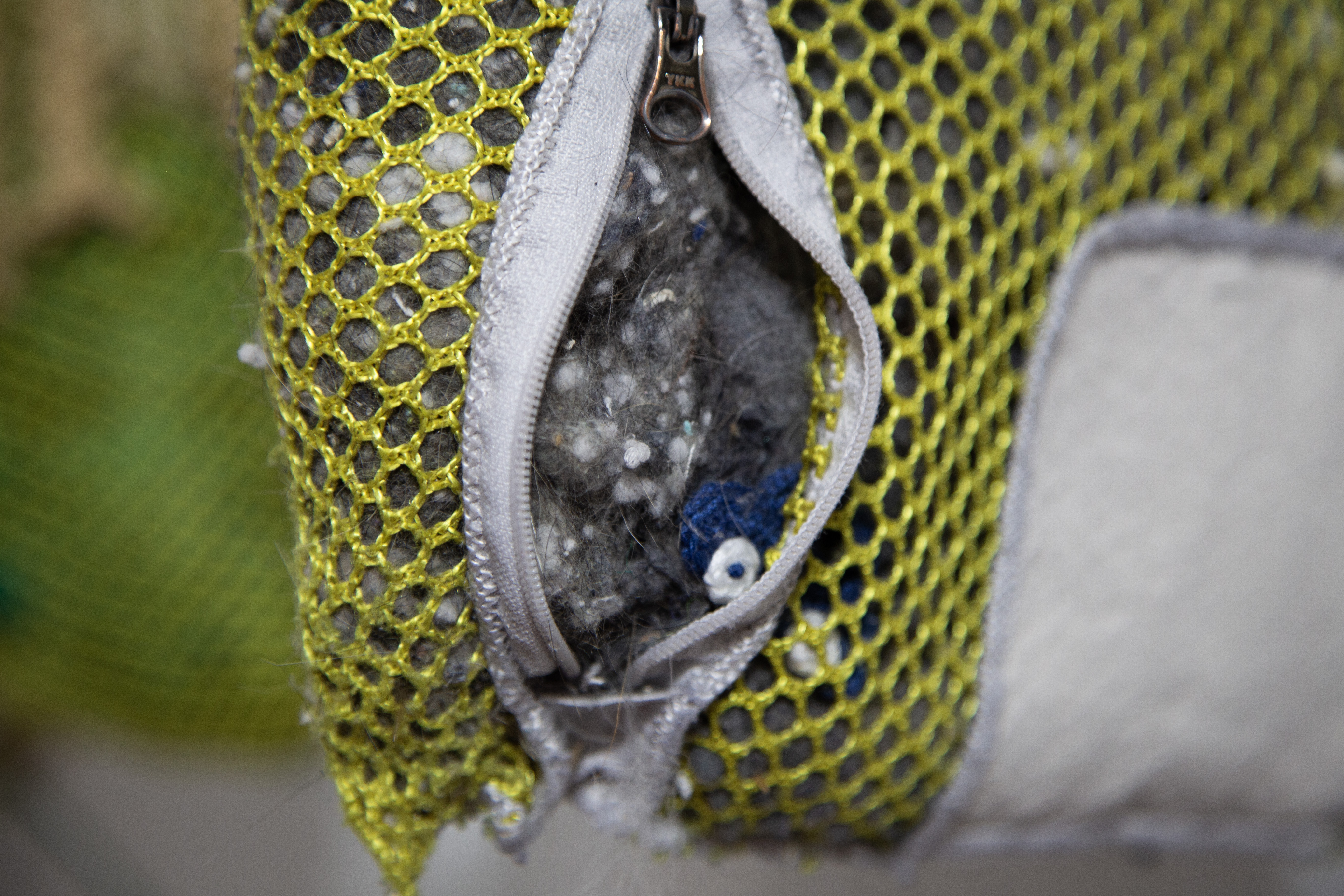 Stuffed reconstructed sports pinnies, faux fur, paracord, lint, crocheted cars, copper pipes & pipe caps